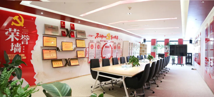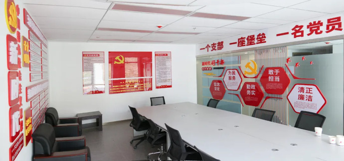 集团党建活动阵地位于集团办公楼11楼,占地180㎡,分为党建文化长廊、党员活动室、支部会议室三个功能区,集党员学习教育、组织生活开展、党建成果展示等功能于一体。其中,党建文化长廊由党建引领发展、传承红色精神、筑牢战斗堡垒、挺膺担当奋进、构建精神文明、建设廉政文化六个部分组成,图文并茂的形式让每一位走过长廊的党员都能深刻领悟党建工作的深刻内涵。党员活动室包含了组织架构展示、荣誉展示、党建工作展示、学习区等内容,配备桌椅茶几等休闲设施,布置温馨,氛围浓厚。